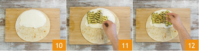 Transferimos la piadina a una tabla de cortar 10, colocamos la mitad de los calabacines sobre el queso 11 y decoramos con las nueces picadas 12.