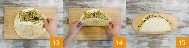 Añadimos un poco de glasa de vinagre balsámico 13, doblamos la piadina por la mitad 14. Preparamos también la segunda piadina de este modo y las servimos 15.
