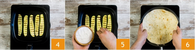 Esperamos unos minutos, les damos la vuelta 4 y continuamos la cocción por el otro lado. Ajustamos de sal 5 y reservamos. Luego calentamos una sartén 6, colocamos la piadina encima, esperamos 30 segundos y le damos la vuelta al otro lado para calentarla otros 30 segundos.