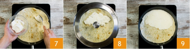 Añadimos la mitad del stracchino solo en un lado de la piadina 7, cubrimos con una tapa 8 y esperamos a que el queso se derrita 9.