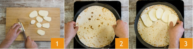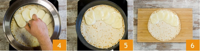 Coloca una tapa 4 y espera otros 30 segundos, hasta que el queso se haya derretido 5. Luego, traslada la piadina a una tabla de cortar 6,