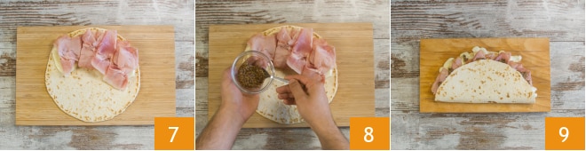 coloca la mitad de las rodajas de jamón 7, añade un poco de mostaza antigua 8 y cierra la piadina 9. Prepara la segunda piadina de la misma manera y sírvelas.