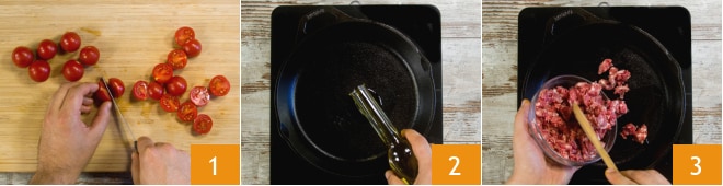 Para preparar la piadina con 'nduja, salchicha y tomatitos, primero cortad los tomatitos por la mitad 1, luego retirad la piel de la salchicha y desmenuzadla. Calentad un chorrito de aceite en una sartén 2 y añadid la salchicha desmenuzada 3.