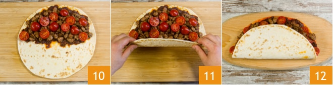 Distribuid la mitad de los tomatitos 10 y doblad la piadina por la mitad 11. Proceded de la misma manera para preparar también la segunda y disfrutad de vuestra piadina con 'nduja, salchicha y tomatitos 12.