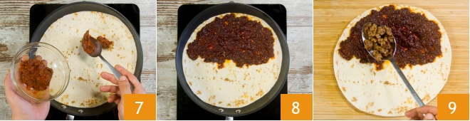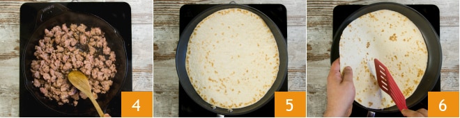 Dorad la salchicha removiendo con una cuchara hasta que cambie de color 4. Reservad la salchicha y calentad la primera piadina en otra sartén durante 30 segundos 5, luego dadle la vuelta 6 para calentarla otros 30 segundos.