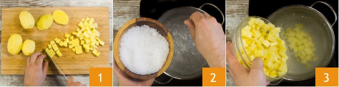 Para preparar la piadina con salchicha y patatas, primero pelad las patatas, luego cortadlas en cubos de aproximadamente 1 cm 1. Poned una olla llena de agua al fuego, llevad a ebullición, sal 2 y coced las patatas durante unos 10 minutos 3, deben quedar tiernas pero firmes.