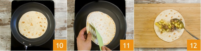 Calentar la piadina en una sartén antiadherente durante 30 segundos 10, luego darla vuelta ayudándose con una espátula 11 y calentarla otros 30 segundos por el otro lado. En este punto, colocad la piadina caliente en una tabla de cortar y rellenad con el relleno 12