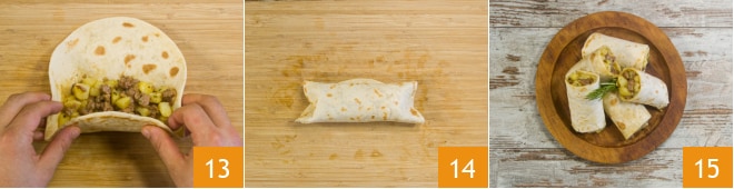 Levantad la piadina de un extremo, cerrad los bordes laterales de la masa para que no se salga el relleno 13 y enrolladla 14. Cortad a la mitad la piadina de salchicha y patatas y servidla bien caliente 15.