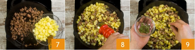Cuando las patatas estén listas, escurridlas directamente en la sartén 7, sazonad con sal y pimienta 8 y aromatizad con el romero picado 9.