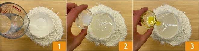 Para realizar los pici cacio e pepe primero prepara la masa: vierte la harina en la superficie de trabajo y forma una fuente, luego añade el agua tibia 1, la sal 2 y el aceite 3.