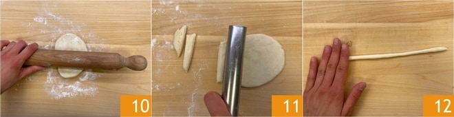 Harina ligeramente la superficie de trabajo y extiende la masa con un rodillo hasta un grosor de 1 cm 10, luego córtala en tiras 11. Trabaja con las palmas de las manos para formar cordones largos y finos, de grosor uniforme 12.