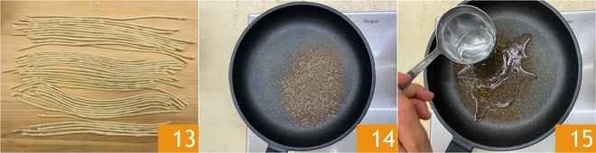 Después de haber formado todos los pici 13, lleva a ebullición una olla con abundante agua ligeramente salada. Mientras tanto, tuesta la pimienta en una sartén 14, desglasando con un cucharón de agua de cocción de la pasta 15.