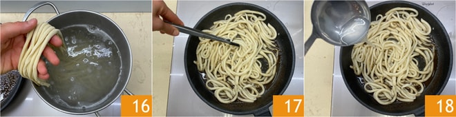 Lanza los pici en el agua hirviendo 16 y escúrrelos directamente en la sartén con la pimienta 17, luego añade un poco más de agua de cocción 18.