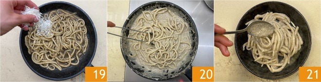 Añade el Pecorino rallado fuera del fuego 19 y mezcla bien para amalgamar todo 20. Sirve los pici con la salsa cacio e pepe 21.