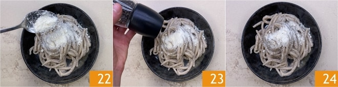 Completa con más Pecorino 22 y una molienda de pimienta 23. ¡Sirve inmediatamente tus pici cacio e pepe 24!