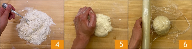 Comienza a mezclar con un tenedor para incorporar la harina al líquido 4, luego continúa trabajando con las manos 5 hasta obtener una masa lisa y homogénea. Envuelve la masa en film transparente 6 y deja reposar en el frigorífico durante 30 minutos.