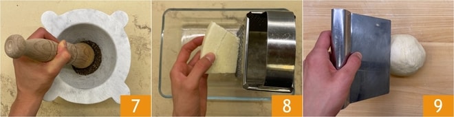 Mientras tanto, machaca los granos de pimienta negra en un mortero 7 y ralla el pecorino 8. Pasado el tiempo de reposo, retoma la masa y divídela en porciones 9.