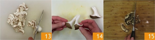 Corta los portobello y champiñones en rodajas finas 13, desgarra los pleurotus con las manos 14 y deja los chiodini enteros. Escurre los porcini secos y pícalos finamente con un cuchillo 15.