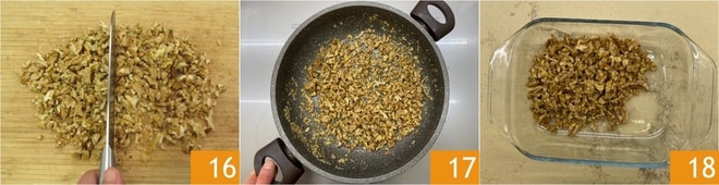 Ahora ocupaos de las nueces: pica groseramente las nueces 16 y tuéstalas durante unos minutos en una sartén con un poco de aceite, así soltarán sus aceites naturales 17. Cuando empieces a percibir su aroma, apaga el fuego y transfiere las nueces tostadas a un bol. Reserva 18.
