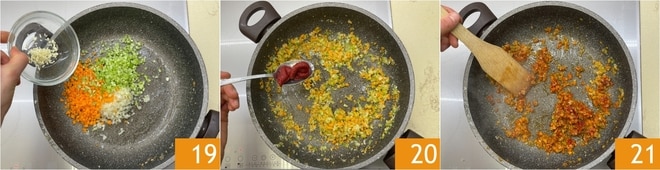 En la misma sartén añade el aceite y las verduras para el sofrito que habrás picado previamente, es decir, cebolla, zanahoria, apio y ajo 19. Deja que el sofrito se ablande a fuego lento, luego añade el concentrado de tomate 20 y mezcla bien para integrarlo 21.