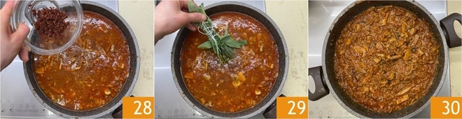 Por último, añade los tomates secos picados 28 y un manojo de hierbas aromáticas frescas que habrás atado con un cordel 29. Deja cocinar suavemente durante 2 horas. Cuando el ragú esté listo 30 lleva a ebullición una olla de agua salada para los pici.