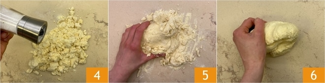 Añade una pizca de sal 4 y amasa con las manos 5 hasta obtener una masa elástica y homogénea 6. Envuélvela en papel film y deja reposar durante 30 minutos en el frigorífico.