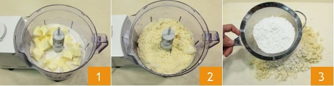 Para preparar la pie de peras, amaretti y chocolate, comienza con la Pasta quebrada: los ingredientes deben estar fríos de la nevera. En un procesador de alimentos, coloca la harina tamizada, una pizca de sal y la mantequilla en trozos recién sacada de la nevera 1. Mezcla todo en varias veces para no calentar demasiado la mantequilla hasta obtener una mezcla con una apariencia arenosa y harinosa 2 y vuelca la mezcla obtenida sobre una superficie de trabajo (o en un bol). Añade el azúcar glas tamizado 3.