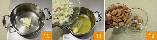 En una cacerola, vierte la mantequilla 10 y derrítela a fuego lento, luego añade las peras 11 y cocina a fuego medio durante unos 3-4 minutos; mientras tanto, reúne en el procesador de alimentos los amaretti 12