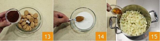 con el cacao 13; en un bol aparte, vierte el azúcar y la canela 14; luego agrega el amaretto de Saronno a las peras y deja evaporar 15;