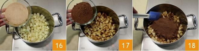añade a las peras el azúcar aromatizado con canela 16 y luego la mezcla de amaretti y cacao 17, mezcla bien con una cuchara 18 y cocina a fuego moderado hasta que las peras hayan perdido su agua, unos 10 minutos;