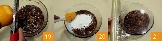 transfiere la mezcla obtenida a un bol y deja templar, luego añade la ralladura de naranja 19 y la fécula de maíz 20, luego cubre con film transparente y deja a un lado 21.
