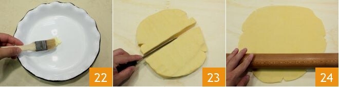luego enrolla el disco en el rodillo, luego desenrolla sobre el molde 25 y ajusta bien el fondo y los bordes, luego corta el exceso de masa (guarda los recortes que servirán para la decoración) 26; pincela el fondo con la mitad de la mermelada de naranja 27.