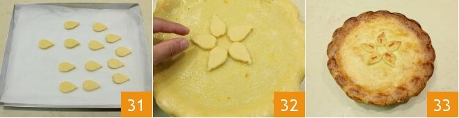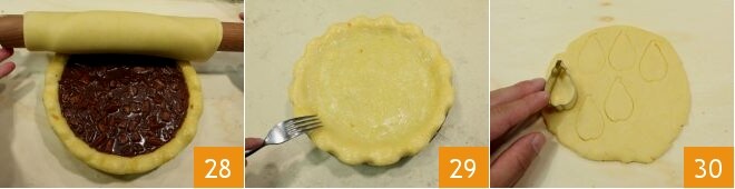 extiende también el otro disco hecho con un tercio de la masa 28; pincela siempre con la mermelada de naranja y con los dientes de un tenedor, perfora los bordes 29, para que al cocinarse, la humedad del relleno pueda salir sin dañar el pastel; amasa y extiende la masa sobrante: puedes crear decoraciones 30