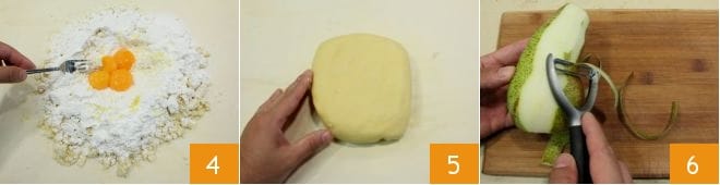 Crea una forma de volcán y en el centro vierte la ralladura de limón y las yemas 4 (puedes aromatizar también con ralladura de naranja, semillas de una vaina de vainilla o canela). Comienza entonces a mezclar todo primero con un tenedor, luego cuando los huevos hayan absorbido la harina, puedes continuar a mano, solo el tiempo necesario para compactar la masa sin calentarla demasiado: haz un paquete, aplánalo 5 y envuélvelo en film transparente. Luego colócalo en el frigorífico para que se endurezca, al menos 30 minutos. Mientras tanto, pela las peras con un pelador 6,