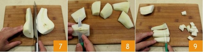 quita el corazón interno, cortándolas por la mitad (7-8) y redúcelas a cubos no muy pequeños 9.