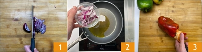 Para preparar los pimientos a la sartén, como primer paso, corta la cebolla en rodajas 1 y ponla a estofar a fuego lento en una sartén con un poco de aceite 2. No la pierdas de vista y remuévela de vez en cuando. Mientras tanto, limpia los pimientos, elimina primero el tallo 3.