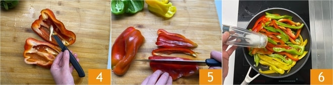 Divídelos por la mitad y elimina los filamentos internos y posibles semillas 4. Luego, corta los pimientos en tiras 5 y, en cuanto la cebolla esté bien estofada, agrégales a la sartén. Añade una pizca de sal 6.