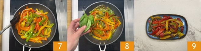 Cocina a fuego medio durante aproximadamente 15 minutos, removiendo principalmente al inicio 7. A medida que se ablanden, revuélvelos lo menos posible para que se doren bien. Aromatiza con hojas de albahaca rotas a mano 8 y sirve tus pimientos a la sartén 9.
