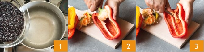 Para preparar los pimientos con arroz negro, salmón y calabacines comenzad cociendo el arroz en abundante agua hirviendo ligeramente salada 1. Mientras tanto, secad y abrid los pimientos a lo largo para eliminar la parte con el rabillo y las semillas internas 2, así como los filamentos 3. Colocad los pimientos en una fuente apta para horno, con la parte abierta hacia arriba.