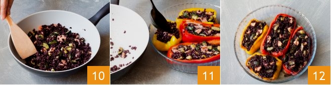 Una vez listo el arroz con salmón y calabacines 10 podéis rellenar los pimientos 11. Colocad en horno estático precalentado a 220° durante 15 minutos. Luego cubrid con papel de horno y continuad la cocción por otros 15 minutos. Una vez listos, sacad del horno vuestros pimientos rellenos de arroz negro, salmón y calabacines. Dejad enfriar ligeramente y servid 12.