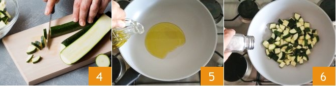 Lavad y cortad los extremos de los calabacines, divididlos a la mitad a lo largo, luego nuevamente a la mitad; después cortadlos en trozos preferiblemente del mismo tamaño 4. En una sartén verted un chorrito de aceite 5, calentad ligeramente y agregad los calabacines. Sal al gusto 6 y cocinad por unos 10 minutos.