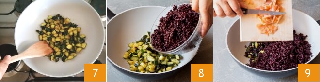 De vez en cuando mezclad hasta que los calabacines estén listos 7. En este punto, añadid también el arroz negro escurrido 8, añadid también el salmón ahumado cortado en trozos 9 y cocinad durante algunos minutos más, justo el tiempo para amalgamar los sabores.