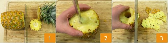 Para preparar la piña a la plancha con miel y canela, primero Cómo limpiar y cortar la piña: corta la parte superior 1, luego con un extractor de corazón especial saca el centro 2 y elimina la piel con un cuchillo 3.