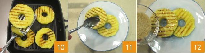 y continúa la cocción durante unos 2 minutos más. Una vez que las rodajas de piña estén bien doradas por ambos lados 10, colócalas en un platillo de servicio y sazónalas con miel 11 y azúcar moreno 12.