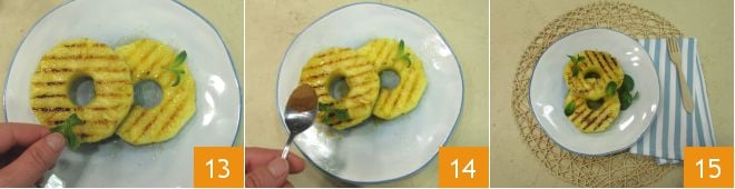 Aromatiza con hojas de menta 13 y canela en polvo 14. Sirve de inmediato tus rodajas de piña a la plancha con miel y canela 15
