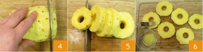 Corta la piña 4 de manera que obtengas unas 6 rodajas de 2 cm de grosor 5. Unta un lado de las rodajas de piña con mantequilla derretida 6.