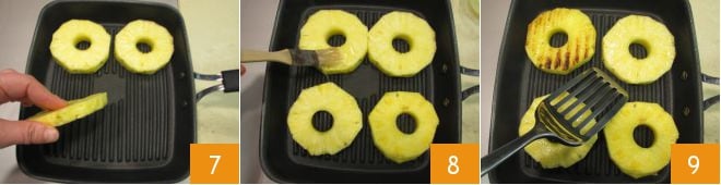 Calienta una plancha y cuando esté bien caliente, coloca las rodajas de piña con el lado untado hacia abajo 7. Deja dorar durante un par de minutos y mientras tanto, unta con mantequilla derretida también la parte de arriba 8. Cuando las rodajas de piña estén bien grilladas, dale la vuelta 9