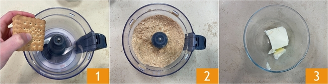 Para preparar las piñas de chocolate, comienza triturando las galletas secas en una batidora 1 hasta reducirlas a un polvo fino y uniforme 2, luego transfiérelas a un bol grande. Vierte la mantequilla en otro bol 3 y derrítela en el microondas.