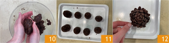 En este punto, forma las piñas modelando la masa en pequeñas pirámides 10; con estas cantidades obtendrás 8. Colócalas poco a poco en una bandeja 11 o en un plato. Ahora puedes pasar a la parte más divertida: decorar las piñas con los cereales de chocolate. Coloca los cereales uno a uno, comenzando por la punta y avanzando hacia la base, creando círculos concéntricos que darán la característica forma de “piña” 12.