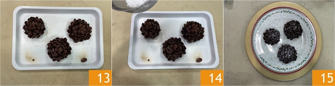 Cuando todas las piñas estén listas 13, llévalas al frigorífico y déjalas enfriar durante al menos media hora. Decora las piñas de chocolate con azúcar glas 14 y sírvelas 15!
